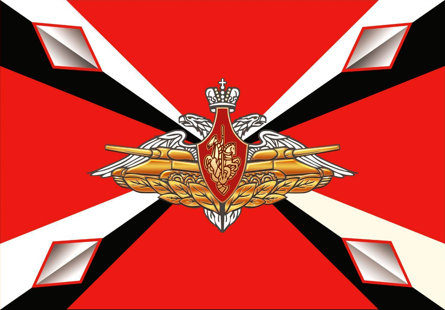 Флаг представляет собой красное полотнище с черно-белым крестом, образованным пересекающимися диагональными полосами, на концах которых расположены ромбы. В центре флага размещается сложный геральдический знак: два золотых танка и орёл, увенчанный короной и щитом с изображением Георгия Победоносца.